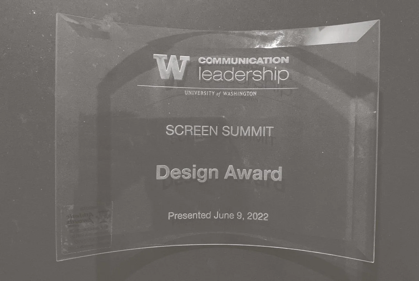 The project won the Design Award at Comm Lead Screen Summit 2022, the annual student project showcase at UW Comm Lead graduate programs.