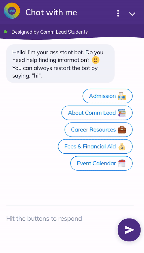 I worked with my team to design a chatbot answering FAQs for prospective students who want to apply for UW Comm Lead graduate programs. The chatbot is launched on the UW Comm Lead Website. The project also won the Design Award at Comm Lead Screen Summit 2022.
